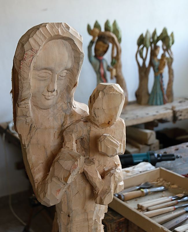 Člověk se v průběhu života mění. Dnes nějak víc vnímám světla kolem sebe a moje sochy mají taky rády barevnost. Používám většinou vosky s patinovanou olejovou polychromií. Dřeva výrazně barevná již svojí podstatou nechávám přírodním stavu s olejovým povrchem který zvýrazní kresbu.